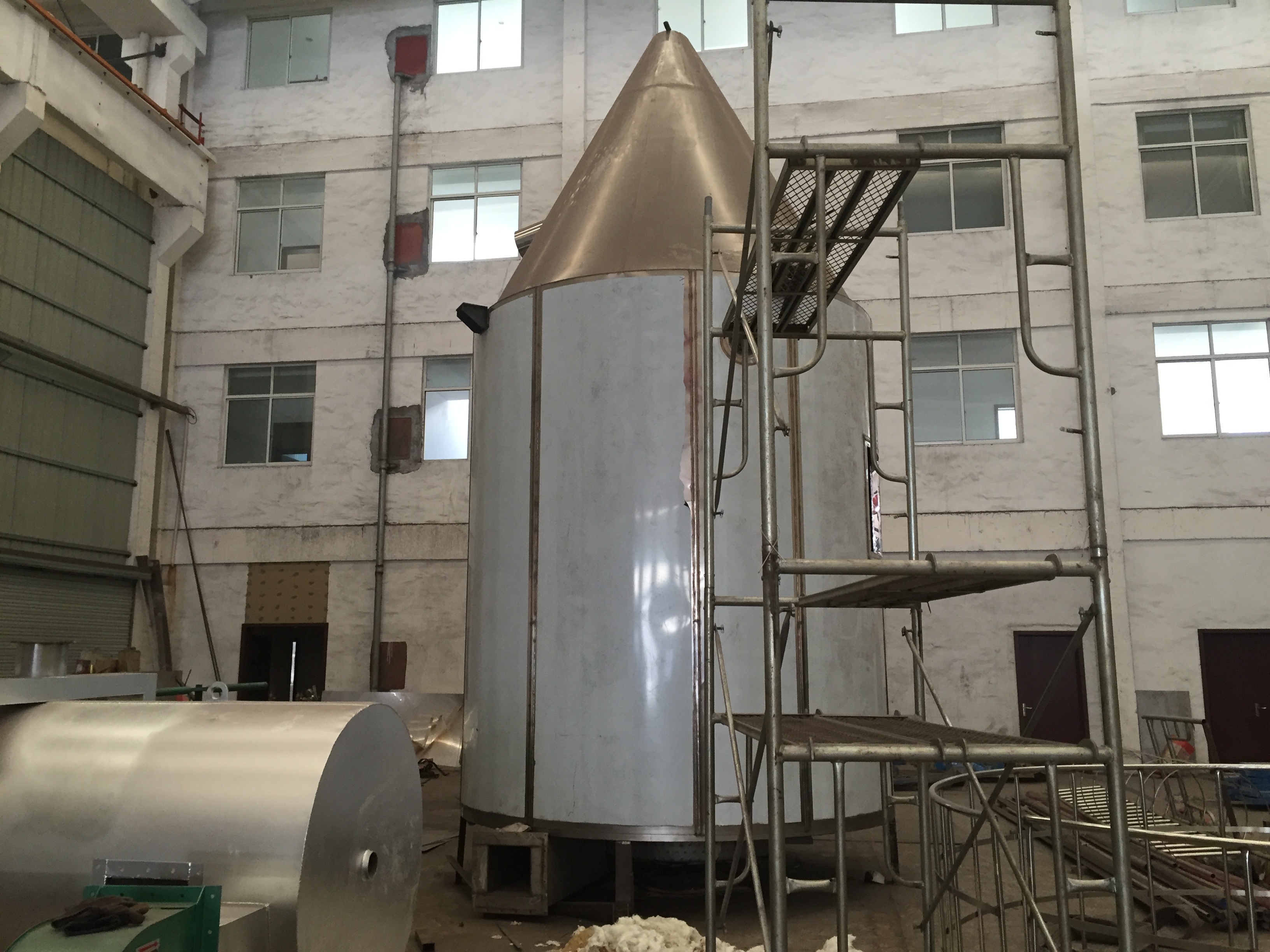 喷雾干燥机为开式循环,并流式,离心式雾化。干燥介质空气经过初、中效空气过滤器过滤后根据操作指令由鼓风机吸取再经加热器加热通过高效过滤器的热风分配器进入喷雾干燥主塔。液体物料根据操作指令经过料液泵,进入高速旋转的离心喷头,在离心力作用下被分散成小雾滴。在喷雾干燥主塔内,小雾滴与热风在充分接触,沿其特定路径进行热交换后被干燥成为产品,然后通过旋风分离器实现分离,固体物料被收集,气体介质再经过过滤后被排出。整套喷雾系统易清洁、无死角,符合GMP要求。